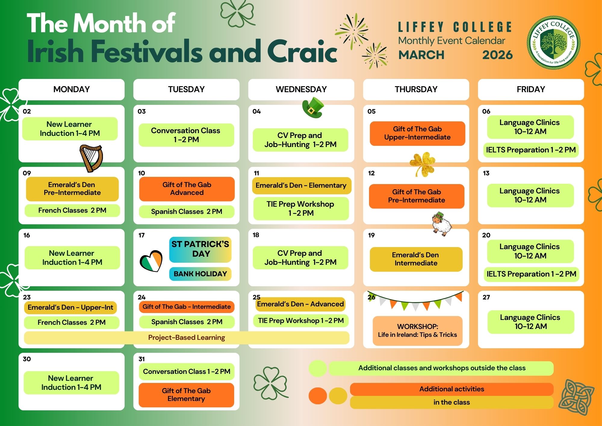Through trips, festivals and social events, students practise English while discovering Irish culture and building confidence.
